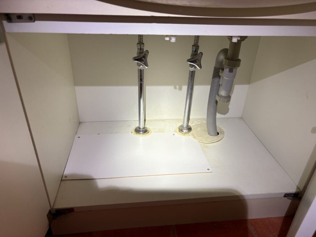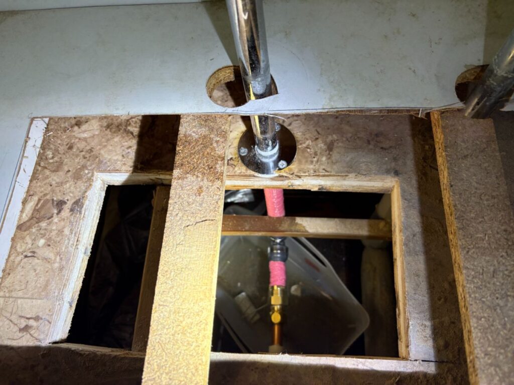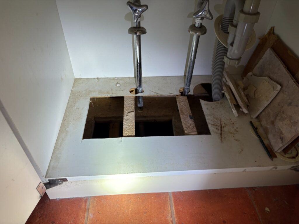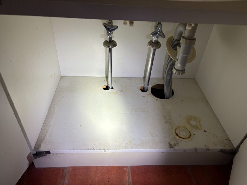 ピンポイントに特定出来れば住宅での部分修理に必要な設備や材料は即日対応出来るよう在庫していますので、お客様に原因や修理方法のご相談をして了解をいただき、化粧台の底板、床を一部開口して工事対応させていただきました。