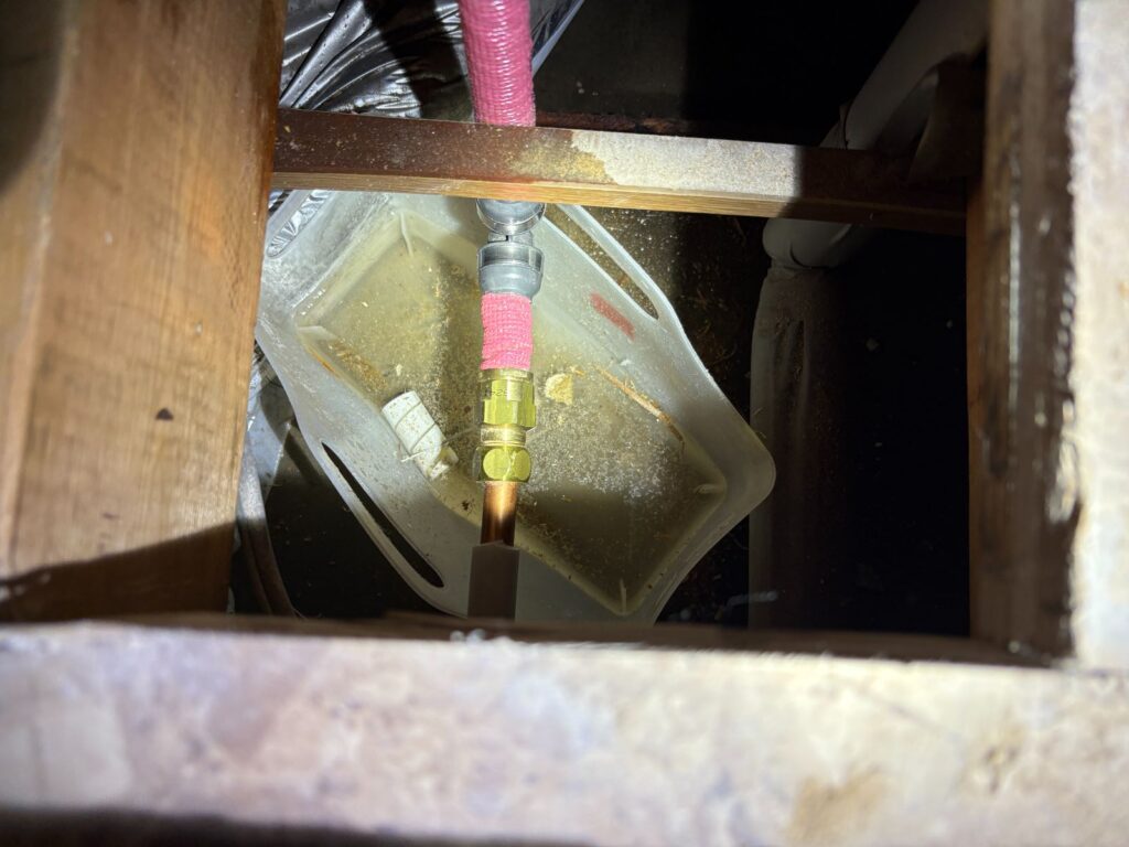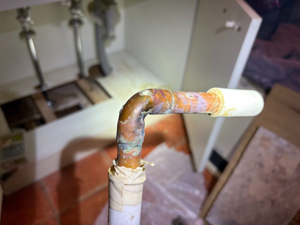 底板、床を開口するとストレート止水栓の左側の給湯管(銅管エルボ)から天井へ漏水している様子が確認出来ました。