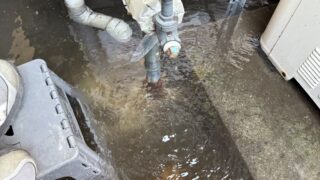 高圧洗浄を実施した際に詰まりの原因がコンクリートマスだったため、排水マスの交換工事を実施させていただきました。土砂の流入や木の根の侵入、排水管の欠損など経年劣化で詰まりの起きやすいコンクリートマスは小口径ビニールマスへ改修するのがオススメです。