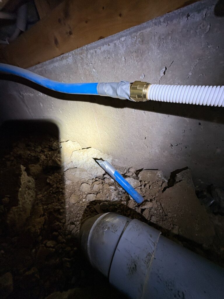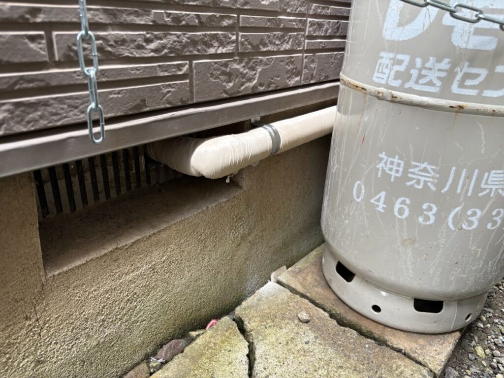 漏水箇所は配管の集中した埋設部分からプロパンガスの下の基礎貫通部分と思われます。