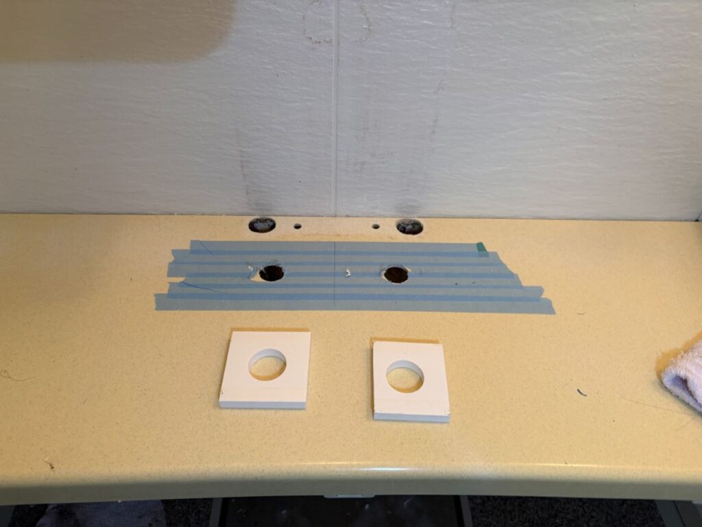 取り付けピッチが85mm、100mm、120mmのいずれかで調整可能なTBV03423J1ですので、カウンター裏の凹凸に注意して任意の箇所に25mm径で穴を開けました。