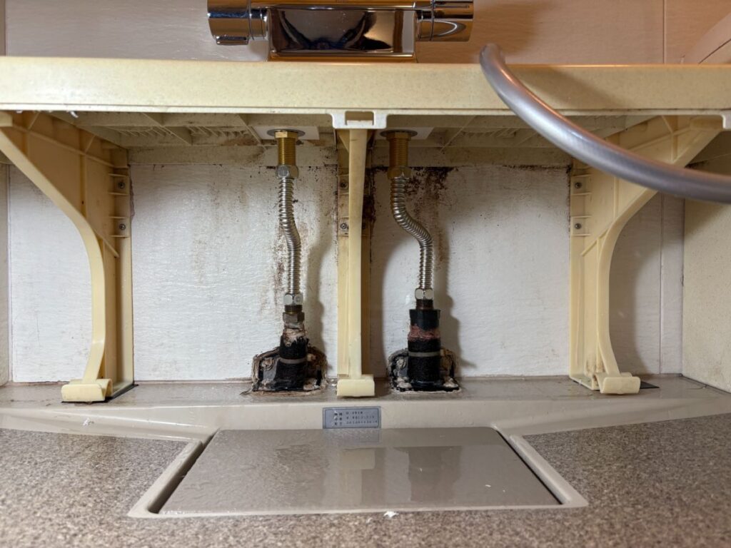 台付き水栓は通常施工どおりに給水・給湯管をフレキ接続すれば取り付け完了です。