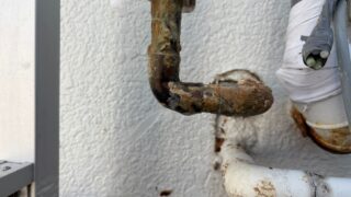 漏水調査・水漏れ修理 【平塚市北金目|ベランダ給湯器配管の漏水】 平塚市のお客様より、ベランダにある給湯器の配管から水漏れしているとのことで修理のご相談をいただきました。給湯管側の銅管にピンホールがあいてしまったようで給湯器下のボールバルブで止水して応急処置しているとのことです。 2026.03.19 平塚市漏水調査・水漏れ修理給湯管の漏水修理
