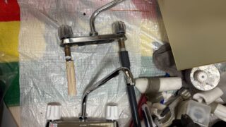 蛇口の交換 【葉山町堀内|アパートの階下漏水原因】 古い建物に多く見られる直結配管で、台付き水栓に直接塩ビ管と銅管が接続されていました。この場合は配管を切断しないと水栓が外すことが出来ず、オネジに変換してフレキ接続する必要があります。左側の銅管でピンホールしていた形跡があり、階下への漏水はここが原因だと判明しました。 2025.12.03 給湯管の漏水修理葉山町蛇口の交換